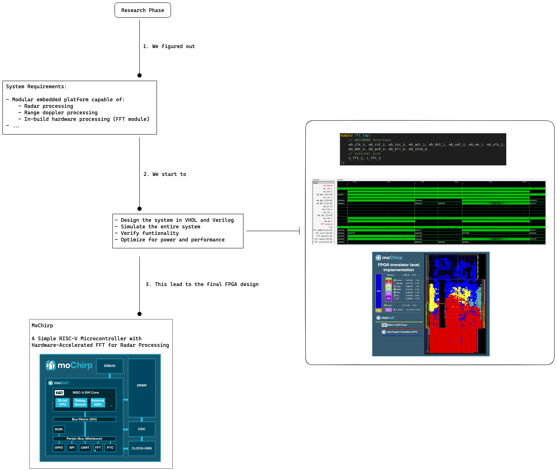 Development Phases: 1. Requirements gathering - Analyzed embedded platform capabilities for radar processing 2. System design - Designed the system in HDL and verified functionality 3. Hardware implementation - Built and optimized the design for FPGA 4. Validation - Tested performance and validated ML workload processing