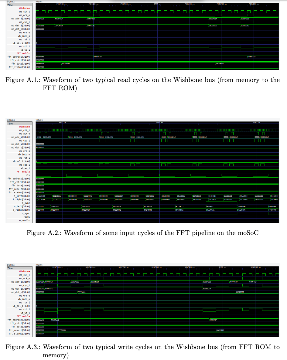 Validated typical read cycles on Wishbone bus (memory to FFT ROM), input cycles of FFT pipeline on moSoC, and write cycles (FFT ROM to memory). Complete functional validation of the FFT accelerator confirmed 100MHz operation on FPGA with real-time signal processing and successful ML workload execution.